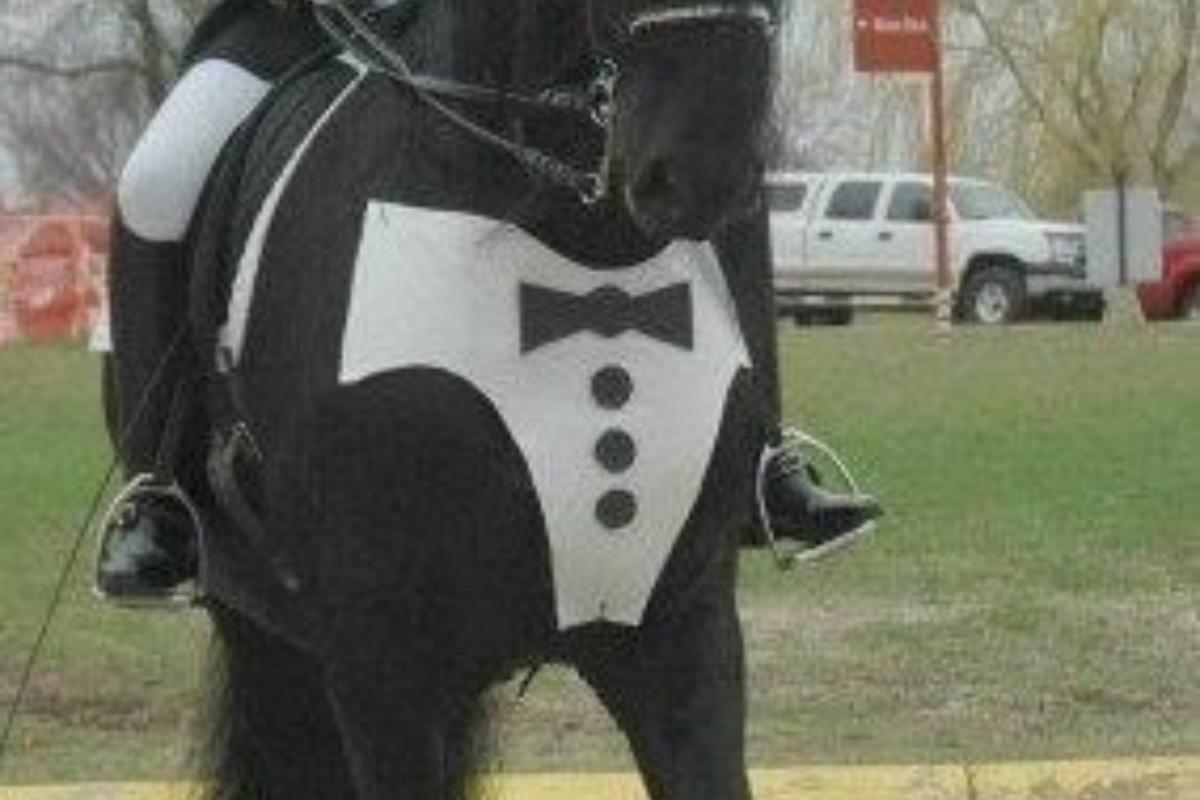 Para poder conseguir este disfraz, tan solo necesitarás utilizar una capa negra para tu caballo que ya tengas. En el pecho y con cartulina blanca, tendrás que dibujar la silueta de una camisa, así parecerá que tiene puesto un esmoquin. A continuación, puedes engancharle una pajarita negra o dibujarle una con rotulador.