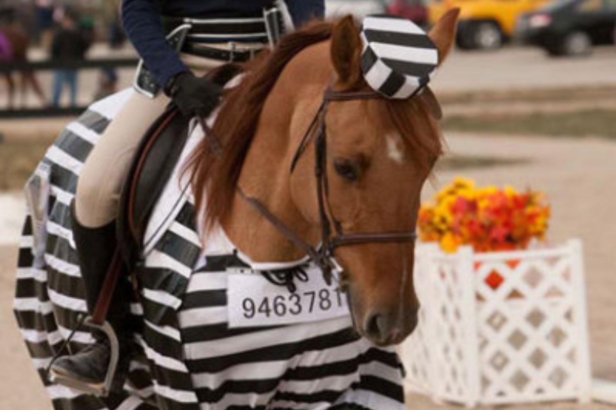 ¡Atención! Llegamos al último de los disfraces para caballos de Halloween y, como no, no podía faltar el de un carcelario. Para poder crear este disfraz para jinetes y caballos, tan solo necesitaremos una capa negra, o blanca, para nuestro caballo. Si consigues hacerte con una que sea a rayas, ya tendrías prácticamente el disfraz completo. Dependiendo del color de la capa que escojamos, las rayas que nosotros dibujemos tendrán que ser del color contrario.
