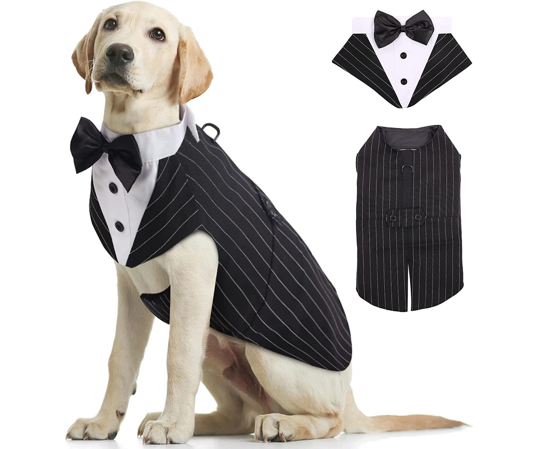 Algo tan sencillo como un esmoquin y una pajarita ofrece muchísimas posibilidades. Este traje puede servir para disfrazar al perro de novio (y su humana o humano de novia), de mayordomo e incluso de Gómez Addams si escogemos uno con rayas.