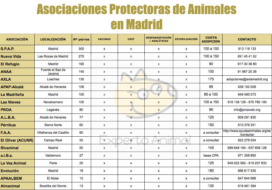 A continuación podrás visualizar dicha tabla comparativa de las Asociaciones Protectoras de Animales en Madrid: