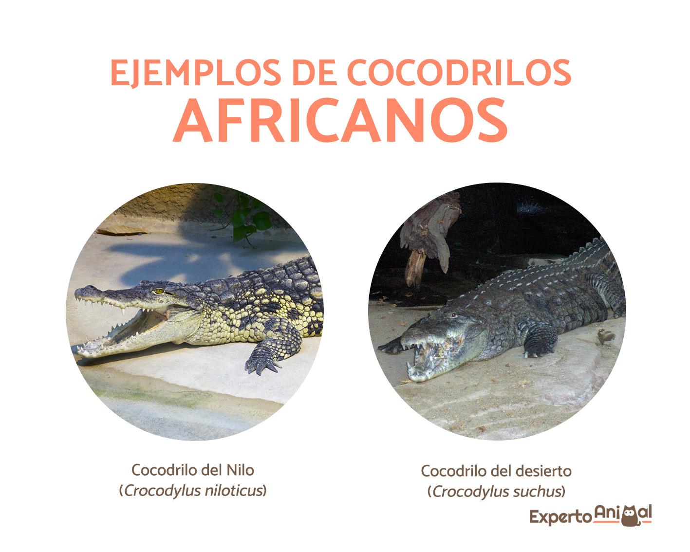 - Cocodrilo del desierto (Crocodylus suchus): el cocodrilo africano occidental o cocodrilo del desierto es nativo de la República del Congo, Uganda, Gambia, Senegal, Mauritania, Burkina Faso, Costa de Marfil, la República Democrática del Congo, Chad, Benín, Zimbabue, la República Centroafricana y Nigeria. Puede alcanzar entre 2 y 5 metros de longitud.