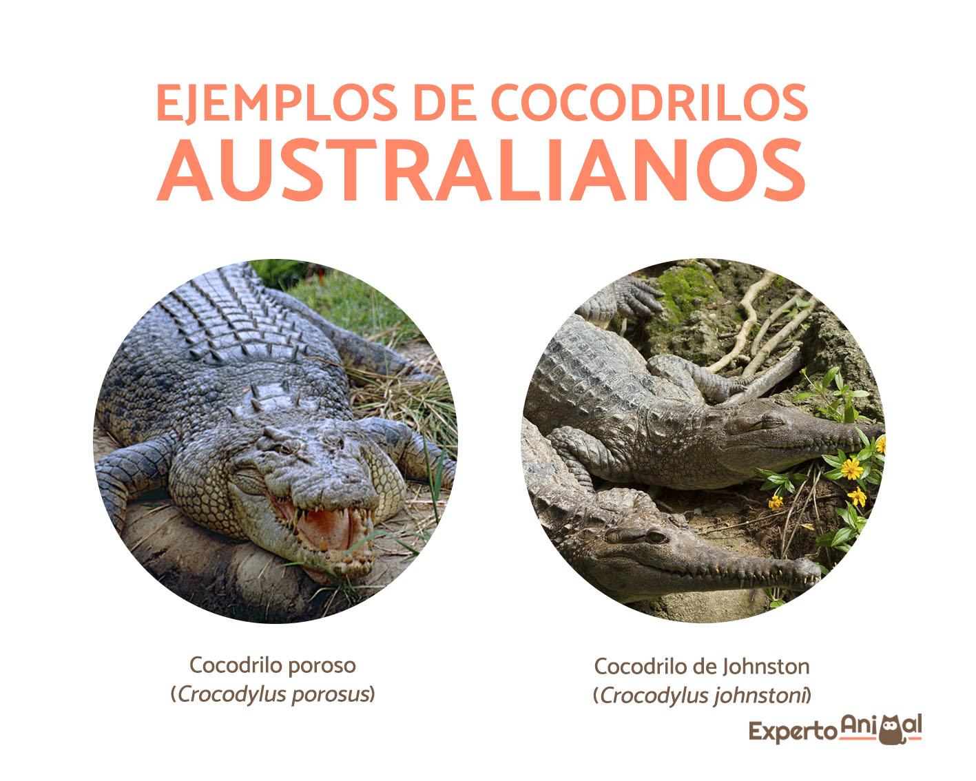 - Cocodrilo poroso (Crocodylus porosus): llamado cocodrilo poroso o marino, habitan ríos, lagos, estuarios y pantanos y son nativos del sudeste asiático hasta el norte de Australia. Pueden alcanzar hasta 6 o 7 metros de longitud, siendo las hembras mucho más pequeñas.