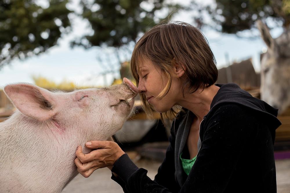 Imagen de un cerdo y una voluntaria en Wings of Heart. Encontrado en: vice.com