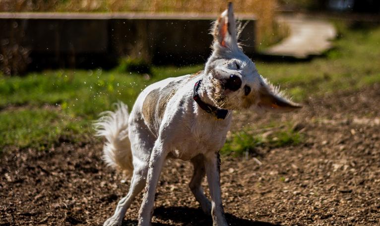 Esta señal nos indica que el perro está bastante estresado y busca liberar su tensión sacudiéndose por completo. Generalmente le siguen una huida y otras señales de calma.