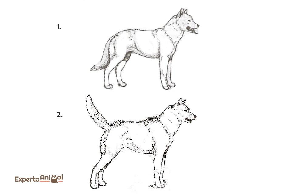 - En la primera figura observamos a un perro seguro de sí mismo y estable. Tiene la cola relajada, las orejas en posición normal y su postura corporal no indica miedo.