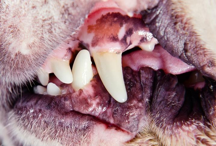 - Enfermedad periodontal: si no se provee al animal de un correcto y constante cuidado bucal, puede llegar a sufrir de enfermedad periodontal y esta, con el pasar del tiempo, es capaz de oscurecer las encías debido a que se ve comprometida la irrigación de las mismas.