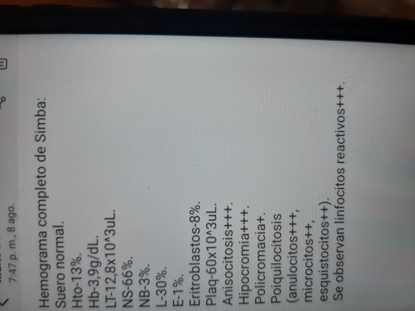 Hola tengo un cachorro de pastor alemán y hace dos días que esta muy decaído y hoy le apareció una secreción nasal un poco verde y en los ojos también le hicieron análisis y dice q tiene mucha anemia el tiene 2 meses estos son los análisis me pueden decir algo al respecto