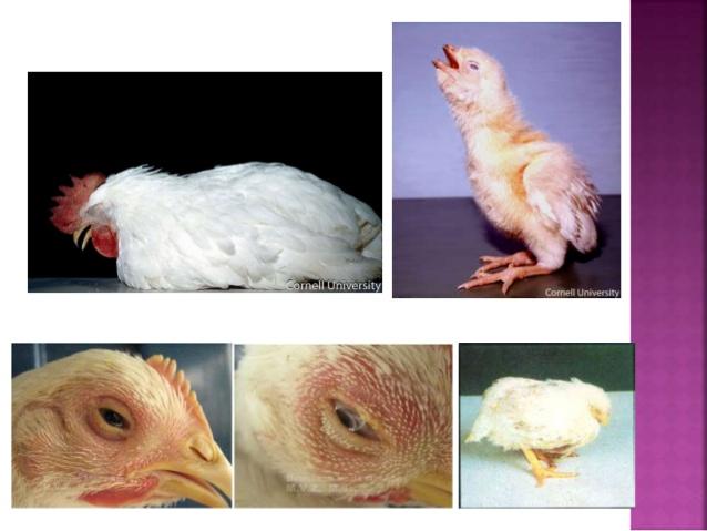 Los síntomas incluyen la muerte súbita, una coloración púrpura en patas y crestas, los huevos tienen la cáscara blanda o están deformados, además, las gallinas ponen menos o dejan de poner, pierden el apetito, están en letargo, emiten heces mucosas, tosen, presentan secreción ocular y nasal, estornudos o andar vacilante. El tratamiento pasa por mejorar el sistema inmunitario del ave con una buena alimentación, ya que es una enfermedad vírica.