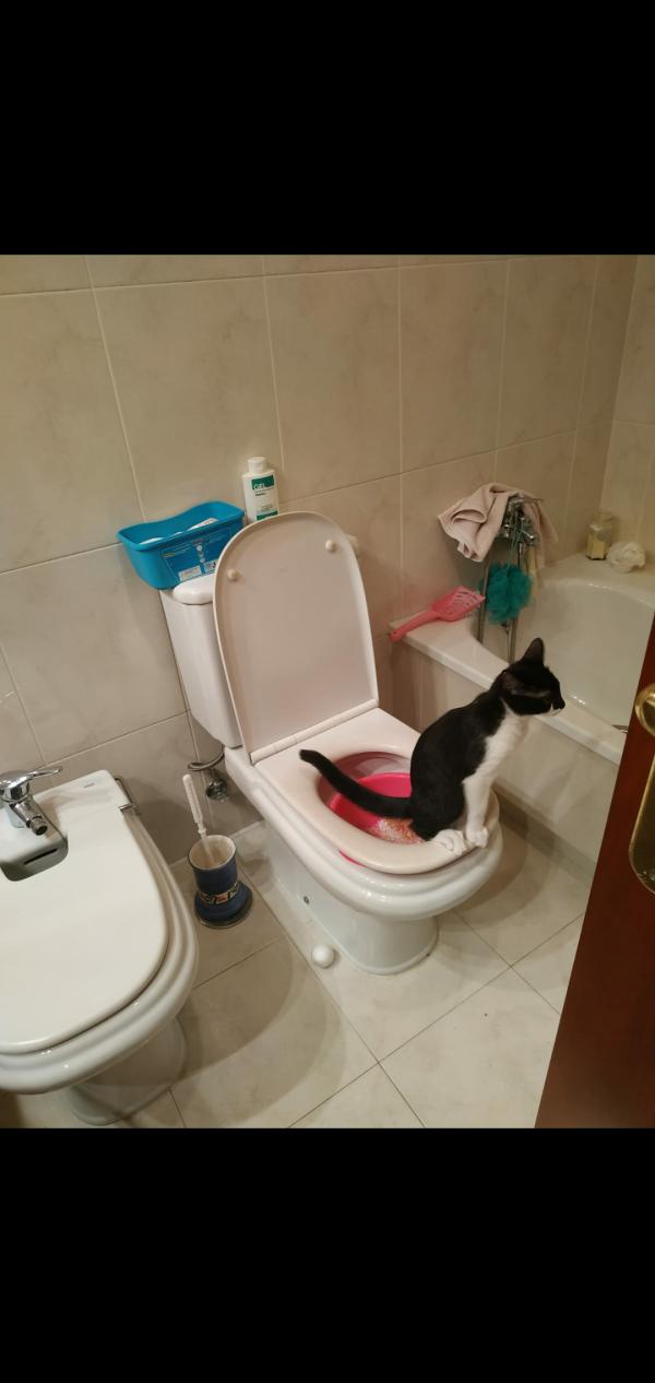 Sustituye la caja por una palangana o similar: Ahora hay que cambiarle la mentalidad al gato. Debe pasar de hacer sus necesidades en la caja a hacerlo directamente en el inodoro. Hay diferentes opciones para hacerlo, desde cajas de entrenamiento que venden en las propias tiendas de animales hasta una simple palangana que tengamos por casa. Podéis crear vuestra caja con una palangana que coloquéis en el váter y un papel resistente que pueda aguantar el peso del gato debajo de la tapa. Además, podéis echar algo de arena para que el gato siga sintiendo un ligero recuerdo a su caja de arena y lo relacione.