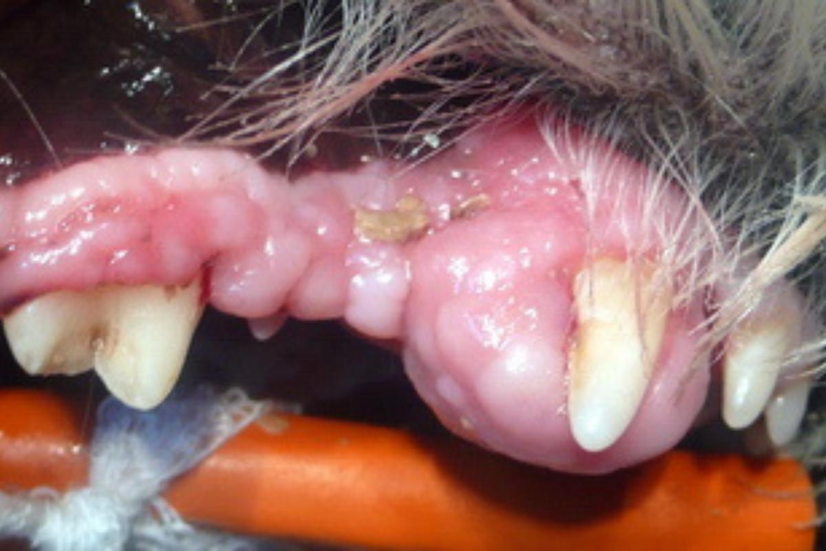 - Masas o crecimientos visibles en la encía del perro, con superficie lisa o rugosa, color rosa claro a rojo más oscuro y de cualquier tamaño.