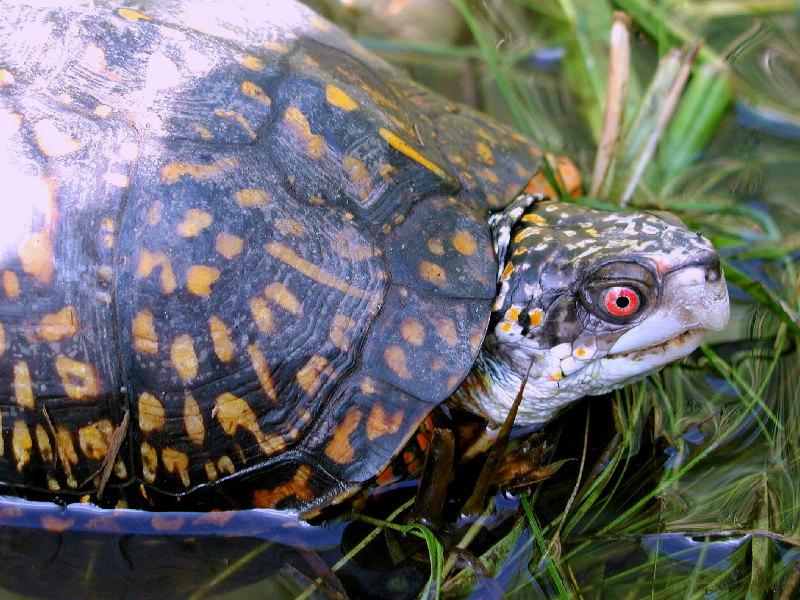 También es conocida como la “tortuga caja” puesto que la parte ventral de su caparazón (plastrón) está articulada permitiendo que el animal pueda meterse en su interior por completo. Presenta un caparazón grande, robusto y una mandíbula superior sobresaliente. Como tortuga terrestre, habita en zonas boscosas y/o praderas donde alimenta tanto de materia vegetal como de algunos pequeños animales (insectos, gusanos, etc.).
