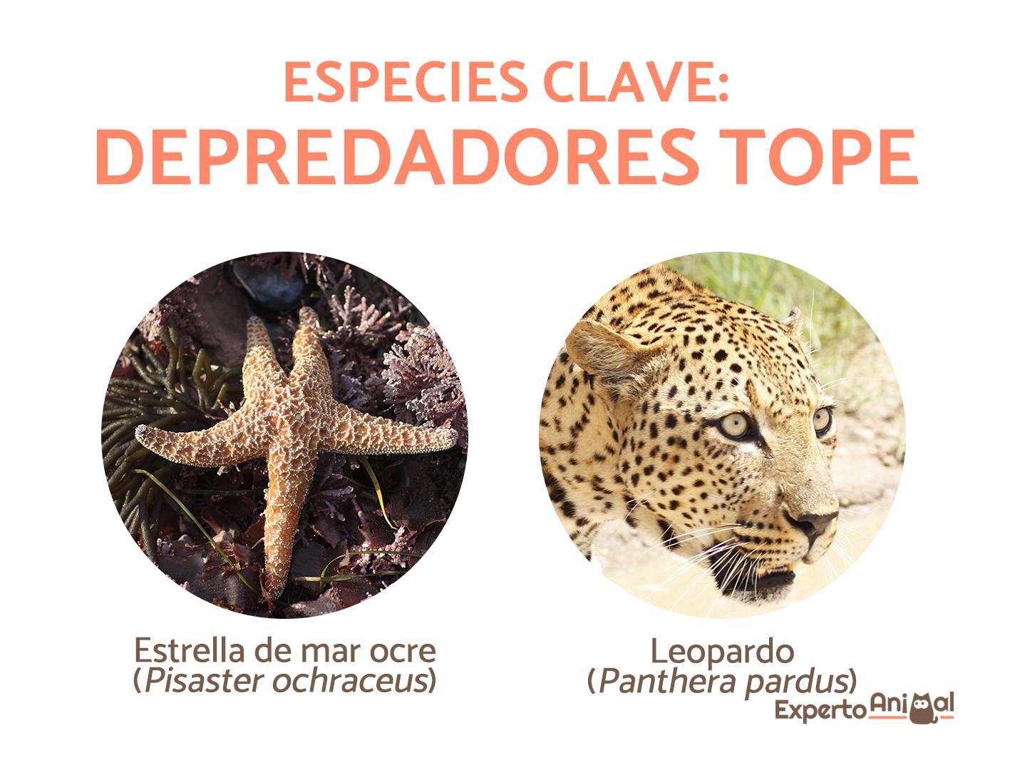 - Estrella de mar ocre (Pisaster ochraceus): deprendan por el espacio y el alimento, modificando la composición de las demás especies y provocando cambios en el ambiente físico que los rodea. Tal es así, que es clave para el mantenimiento de la salud y la calidad de las aguas de las costas del Pacífico de América del Norte. Por otro lado, mantiene los crecimientos explosivos de ciertas especies de mejillones, por ejemplo, que en ausencia de esta estrella de mar, proliferarían e impedirían que otras especies se establezcan.