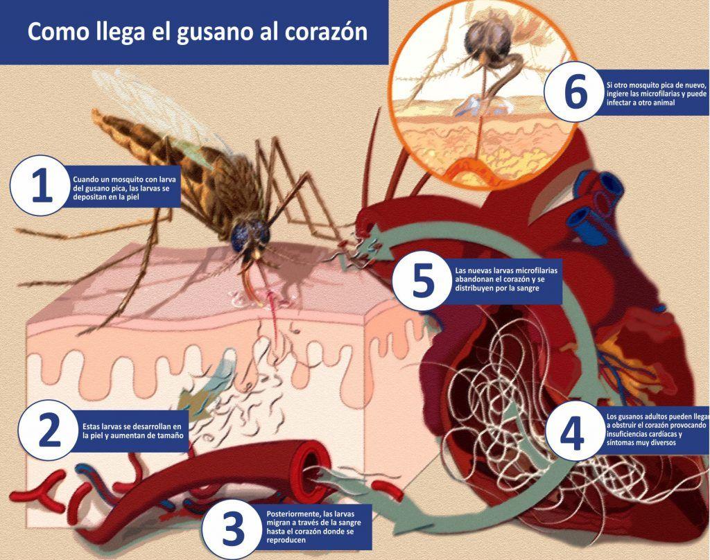 El perro se infesta cuando un mosquito le pica, llevando en su boca larvas infestivas de filaria que se introducen en su cuerpo en ese momento. Las larvas son capaces de excavar en la piel y van sufriendo diferentes modificaciones hasta lllegar a la madurez. Pueden ser atajadas con varios fármacos, en función de la fase vital en la que se encuentren.