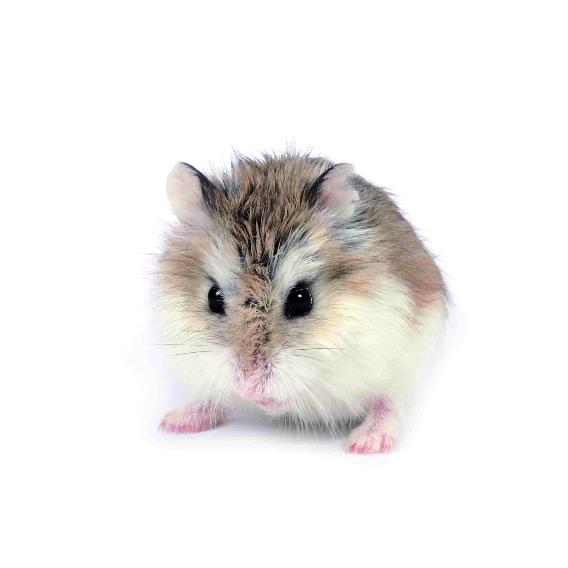 Como ya hemos comentado antes, este hámster es de un tamaño excepcionalmente pequeño, midiendo pues escasos 5 centímetros y pesando 20 gramos como máximo. Son de color marrón en el dorso y blancos en el vientre. Destacamos sus manchas blancas encima de los ojos, que le dan un toque despierto y dulce.