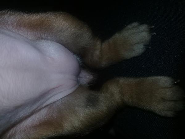 Mi perrita salchicha tiene 19 días,y hoy le encontramos dos especies de pelotitas por enzima de su entrepierna.