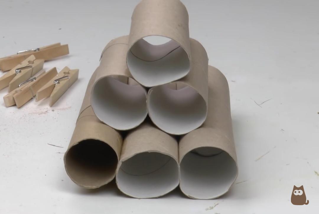- Sobre la base de cartón, pega los tubos en forma de pirámide. Utiliza un pegamento apto para animales por si tu perro rompiera el juguete. También puedes llenar toda la base con los tubos sin necesidad de darle forma de pirámide e incluso dejar volar tu imaginación y darle la forma que quieras. Las formas dificultarán el juego.