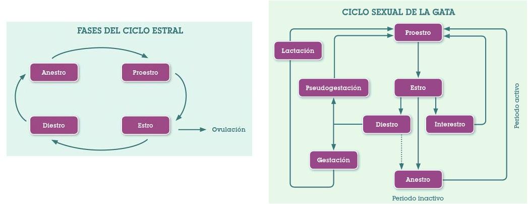 - Tras el parto: la gata puede atender la lactación junto a una nueva gestación (recupera el ciclismo a las 48 horas del parto o, si es época, entrará en anestro estacional).