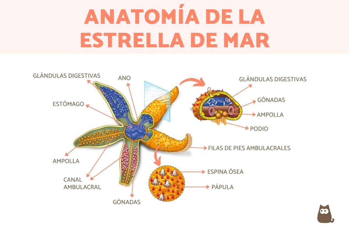 La anatomía de la estrella de mar se caracteriza por su simetría radial (generalmente pentarradial, es decir, con 5 brazos, aunque algunas especies pueden presentar hasta 20 brazos), con varios brazos que se extienden desde un punto central. Estos brazos contienen una compleja red de canales del sistema hidrovascular, permitiendo movimientos coordinados y la capacidad de succionar y expulsar agua. Aunque su sistema nervioso es rudimentario en comparación con los vertebrados, las estrellas de mar exhiben comportamientos sorprendentes, como la capacidad de regenerar brazos perdidos.