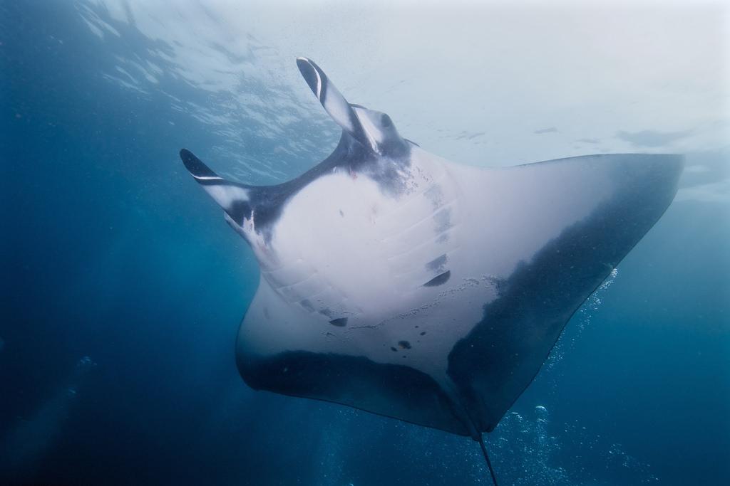 La manta raya de alas negras, Manta birostris, se trata de otro gigante que se nutre de plancton. Este pez enorme puede medir sobre unos 6 m de envergadura.