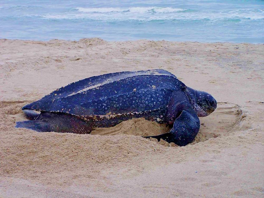 La tortuga laúd o Dermochelys coriacea es probablemente una de las tortugas más populares de la fauna del Caribe mexicano. Esta es la mayor tortuga marina. Puede medir más de 2 metros y 600 kg de peso. Como las demás, está amenazada.