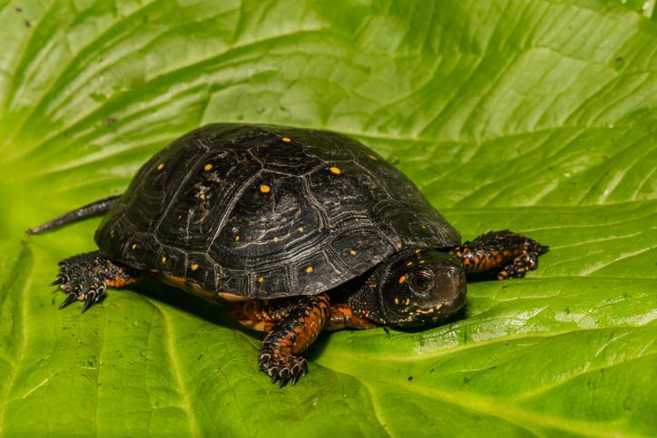 - Tortuga moteada (Clemmys guttata): es semiacuática, requiere de un terrario de 200 metros y al menos 200 litros de agua. Es carnívora, diurna e hiberna en el agua.