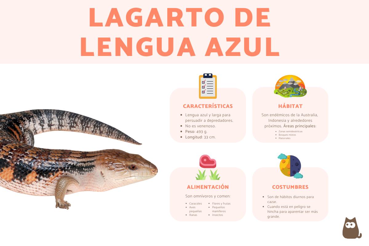 - Destaca por su lengua de color azul y larga, que usa como un método de persuasión a sus depredadores. Cabe destacar que el lagarto de lengua azul no es venenoso.