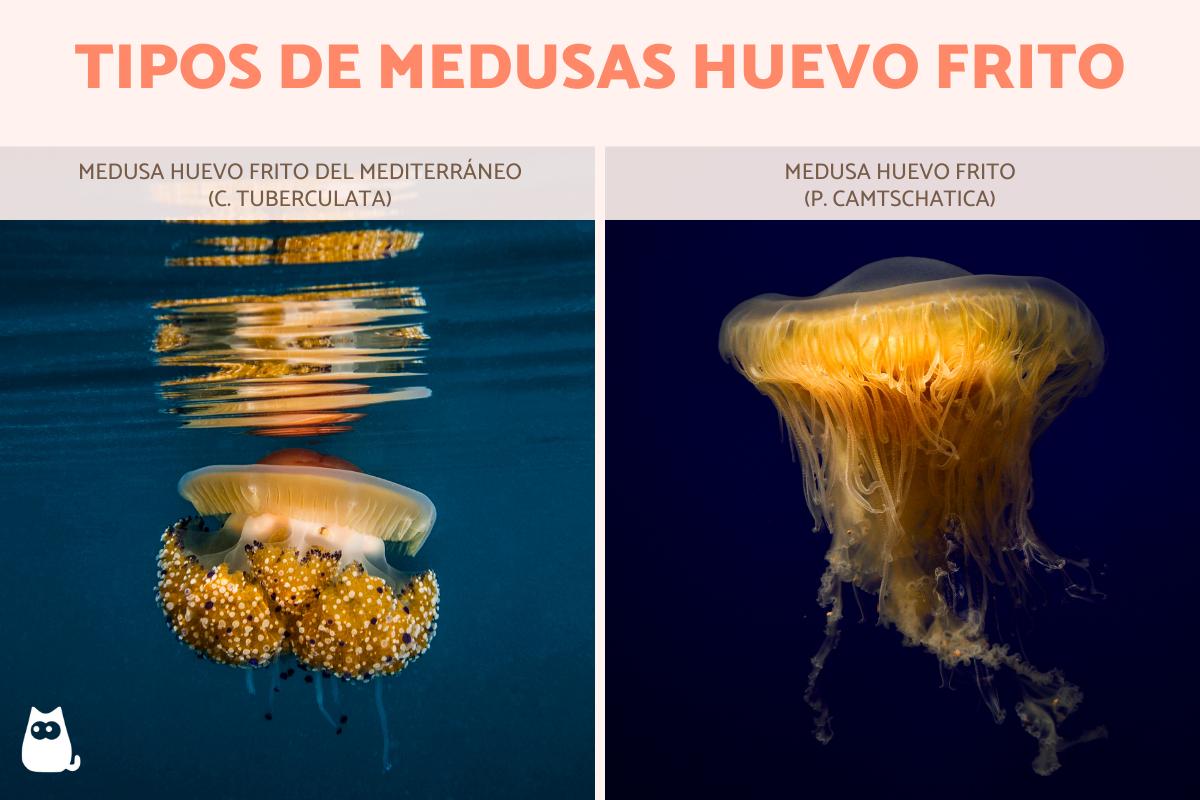 - Medusa huevo frito del Mediterráneo (C. tuberculata): es natural de los mares Mediterráneo, Ego y Adriático. Aunque generalmente ronda los 15 cm de diámetro, puede alcanzar hasta unos 40 cm. Posee una cúpula central elevada, rodeada por un anillo central y esta es la parte que observada desde arriba simula un huevo frito, además, posee muchos apéndices cortos y otros largos. Esta medusa posee la sustancia tóxica propia de los cnidarios. No obstante, los efectos para las personas no son tan peligrosos, exceptuando personas sensibles, a quienes al contacto con la piel puede generar picazón y ardor en la zona.