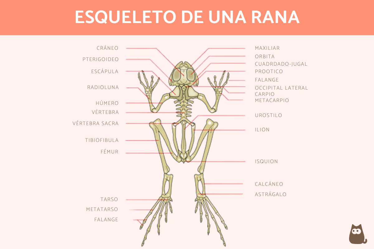 ¿Cómo es una rana por dentro? El sistema óseo de las ranas se ha modificado de otros vertebrados para permitir tener dos tipos de desplazamiento, uno nadando y el otro saltando. De esta manera, sus estructuras esqueléticas están en algunos casos transformadas. Las ranas tienen casi cerca de 30 tipos de huesos, pero hay que tener en cuenta que algunos se repiten como las falanges, por lo que suman más piezas óseas.
