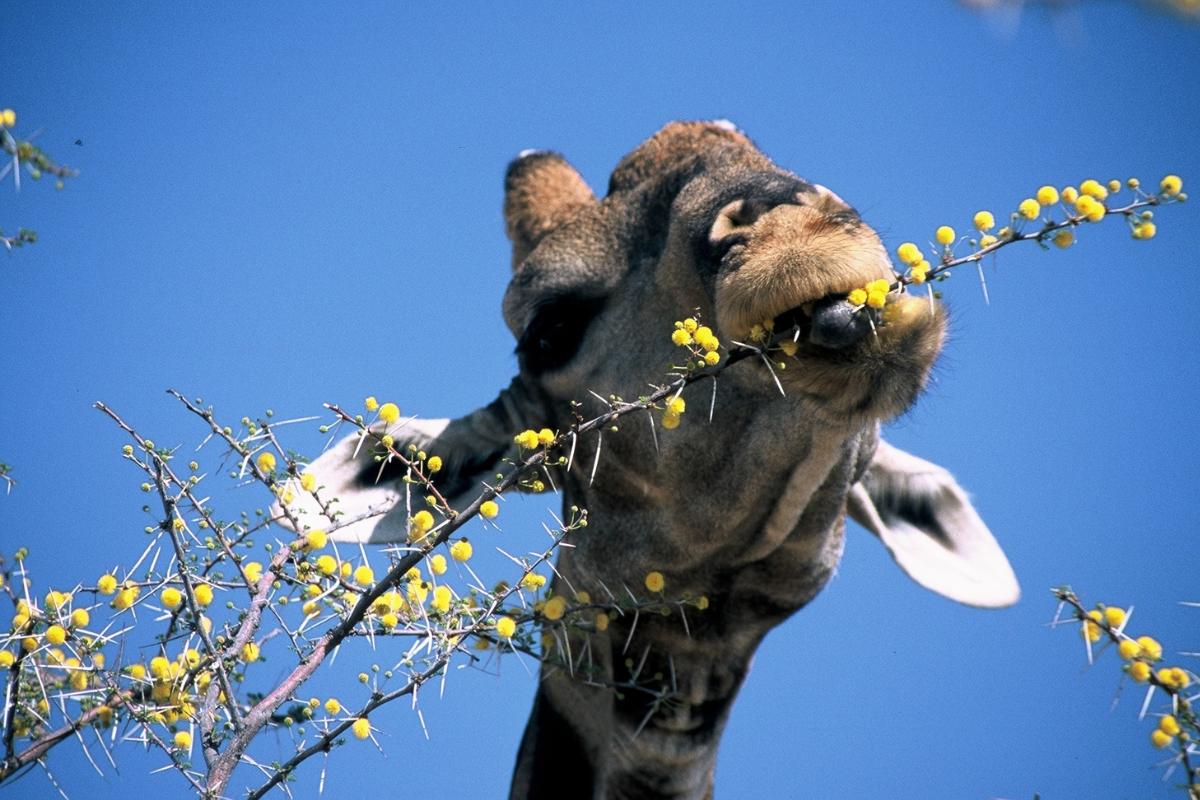 Con esta lengua musculosa la jirafa tiene la capacidad de tomar la vegetación espinosa que se encuentra en las copas de los árboles, a los que solo ella puede alcanzar por su altura. Su planta preferida es la acacia, que se caracteriza por ser una planta espinosa, lo que no limita a este rumiante de tomarla y consumirla gracias a las características de su lengua.