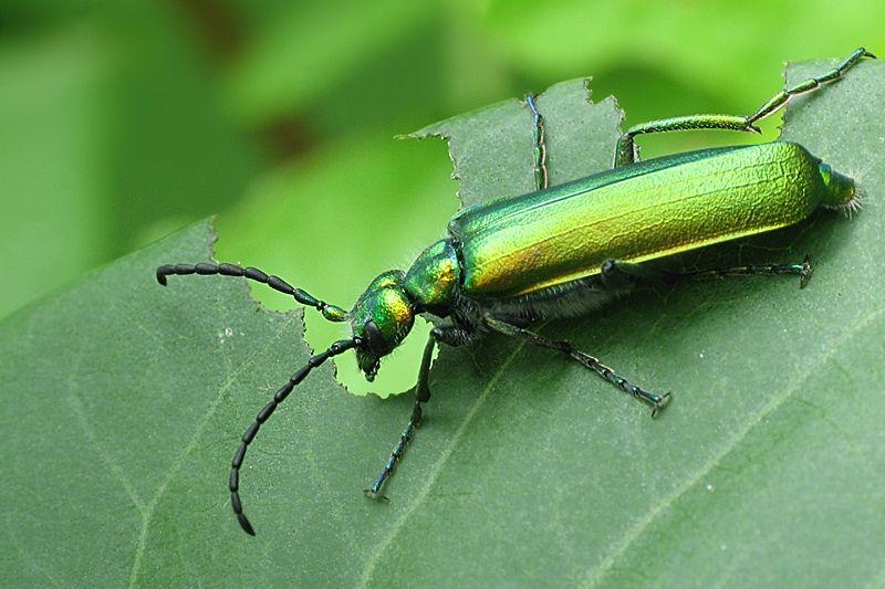 También conocido comúnmente como cantárida, es un insecto que mide 22 mm de largo y 8 mm de ancho. Presenta una tonalidad verde brillante en todo su cuerpo y vive en las ramas de los árboles en Europa y África.