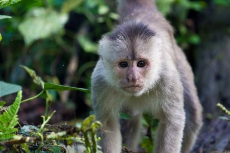 El capuchino de frente blanca (Cebus albifrons) es una de las especies más pequeñas del grupo de los capuchinos, pero con un peso mayor que el resto de las especies antes mencionadas. El rango de peso oscila entre 1 y 3.3 kg, en cuanto a las dimensiones no supera los 50 cm y la cola mide casi lo mismo que el cuerpo. La coloración general es marrón claro y amarillo pero presenta ciertas combinaciones claras y oscuras en algunas zonas del cuerpo.