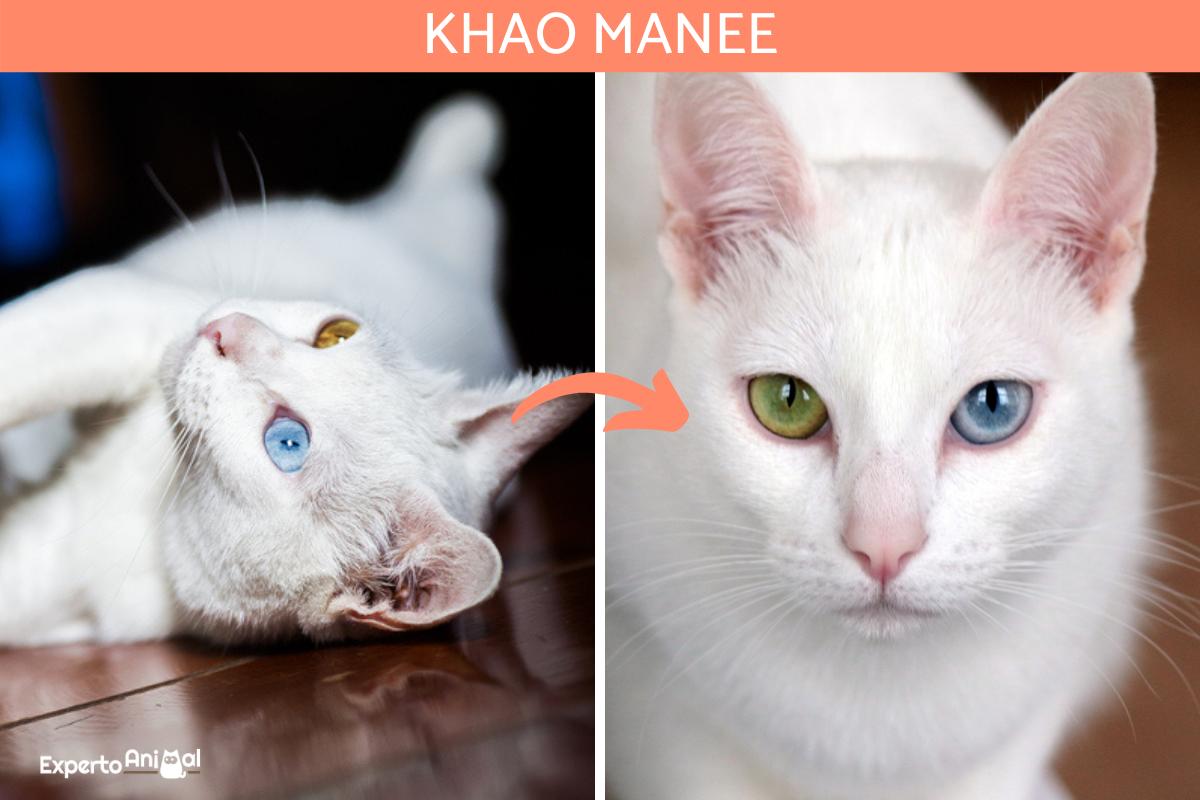 Los gatos de raza khao manee cuando nacen presentan una mancha oscura en su cabeza, pero cuando pasan unos meses, dicha mancha desaparece y todos los ejemplares adultos son totalmente blancos.
