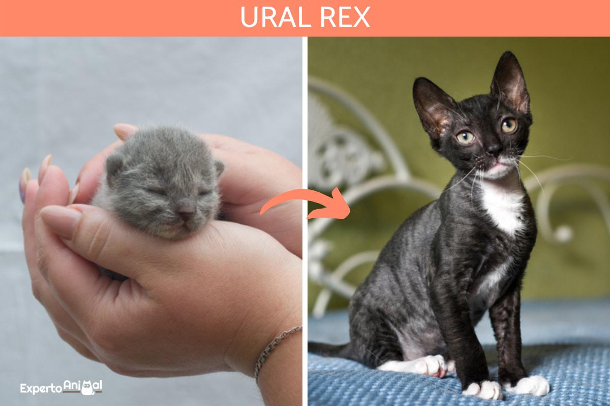 Otro ejemplo son los gatos ural rex, que nacen siendo grisáceos y tras la primera muda van adquiriendo el color definitivo. Además, a los 3-4 meses les comienza a salir el pelo ondulado que caracteriza a la raza, pero no es hasta los 2 años de edad que el cambio se completa y adquieren el fenotipo de ural rex adulto.
