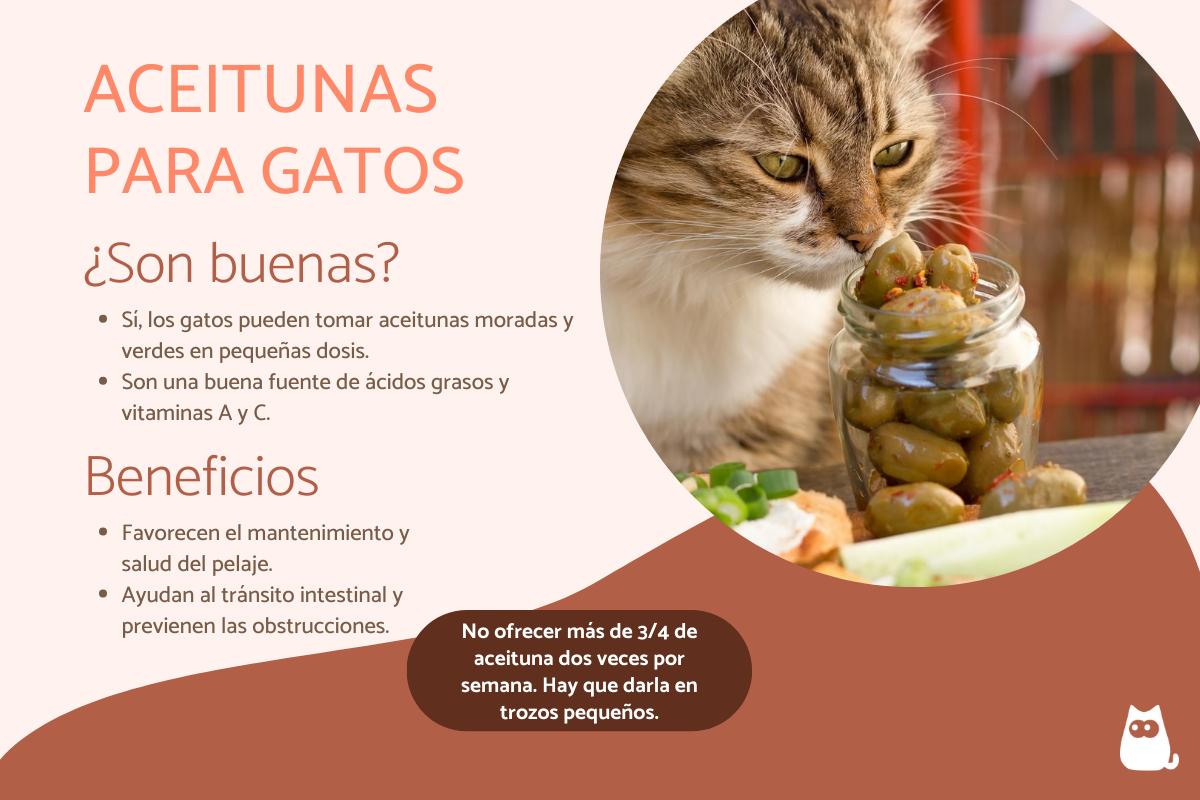 Las aceitunas son un alimento muy rico en nutrientes buenos para la salud de un organismo como el del gato. Este producto es rico en ácidos grasos beneficiosos como es el ácido oleico, que mejorará la calidad del pelaje de tu pequeño felino para que se vea lustroso y brillante.