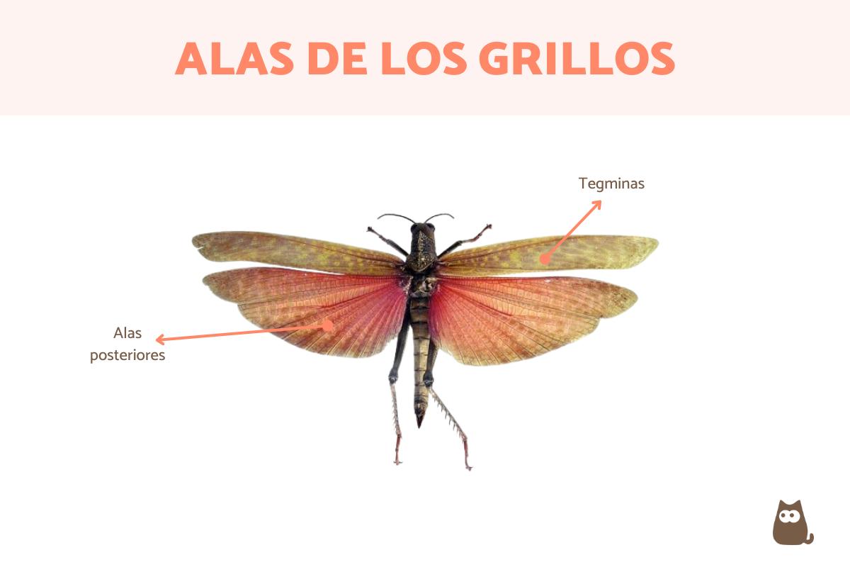 Los grillos están anatómicamente adaptados tanto para el vuelo como para el salto, de modo que pueden ejecutar ambas acciones. Sin embargo, en relación al vuelo, según la especie de grillo pueden presentar dos pares de alas que varían de tamaño, estando en algunos casos bastante reducidas o ausentes, por lo que no todos los grillos pueden volar. Cuando los dos pares de alas están presentes, las primeras se conocen como "tegminas" y corresponden con unas estructuras altamente esclerotizadas, formadas por quitina, lo que les da una dureza particular. También suelen presentar una nerviación propia de cada familia, un rasgo característico en los ortópteros. En el caso de los machos, aquí se ubican los órganos estriduladores, usados para producir el típico sonido de los grillos. Luego, encontramos el segundo par que, cuando están presentes, son las alas propiamente dichas. Estas se pliegan o doblan debajo de las tegminas y se caracterizan por ser membranosas; si están bien desarrolladas, permiten entonces el vuelo en los grillos.
