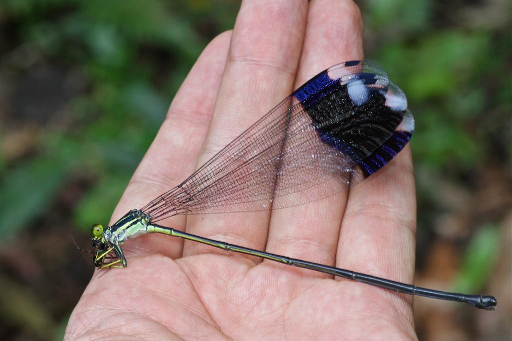 Magrelopepus caerulatus, es un bellísimo zigóptero que aúna belleza con gran tamaño. Su envergadura llega hasta los 19 cm., con unas alas que semejan de cristal y un abdomen finísimo.