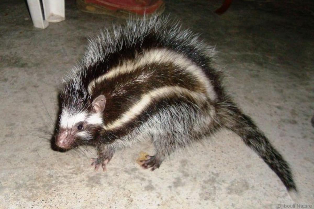 La mofeta rayada es nativa de Canadá y Estados Unidos y su estado de conservación es de Menor preocupación. Este ejemplo de mamífero venenoso se distingue por su color negro con una franja blanca que recorre todo el centro superior del cuerpo. Pesa entre unos 0,7 hasta 3 kg, mientras que el tamaño va de 45 a 80 cm. Su defensa consiste en la producción de un almizcle en su glándula anal, que puede expulsar hasta unos 2 m de distancia, que no solo es maloliente, sino que si entra en contacto con los ojos de una persona puede causarle una ceguera temporal.