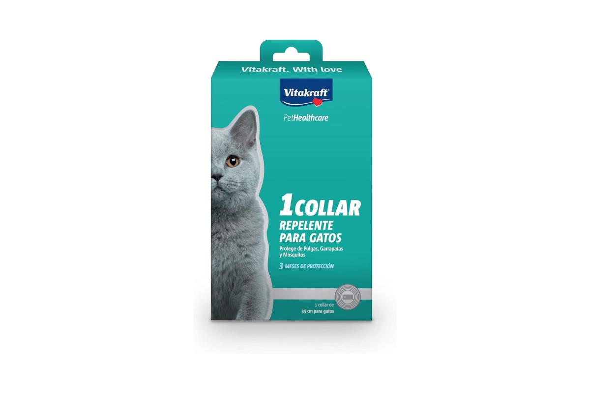 Por último, otra opción económica para repeler pulgas y otros parásitos externos en gatos es el collar repelente con biocida de Vitakraft. Se trata de un collar compacto de 35 cm, ideal para proteger frente a pulgas, garrapatas, mosquitos y piojos gracias a las propiedades repelentes del extracto de margosa (neem), el extracto de Chrysanthemum cinerariaefolium —que actúa como un piretroide natural— y el aceite de lavanda. Todos estos ingredientes están catalogados como biocidas repelentes, en este caso de tipo olfativo, ya que liberan aromas desagradables para los parásitos externos, evitando que se acerquen a los gatos que lo llevan.