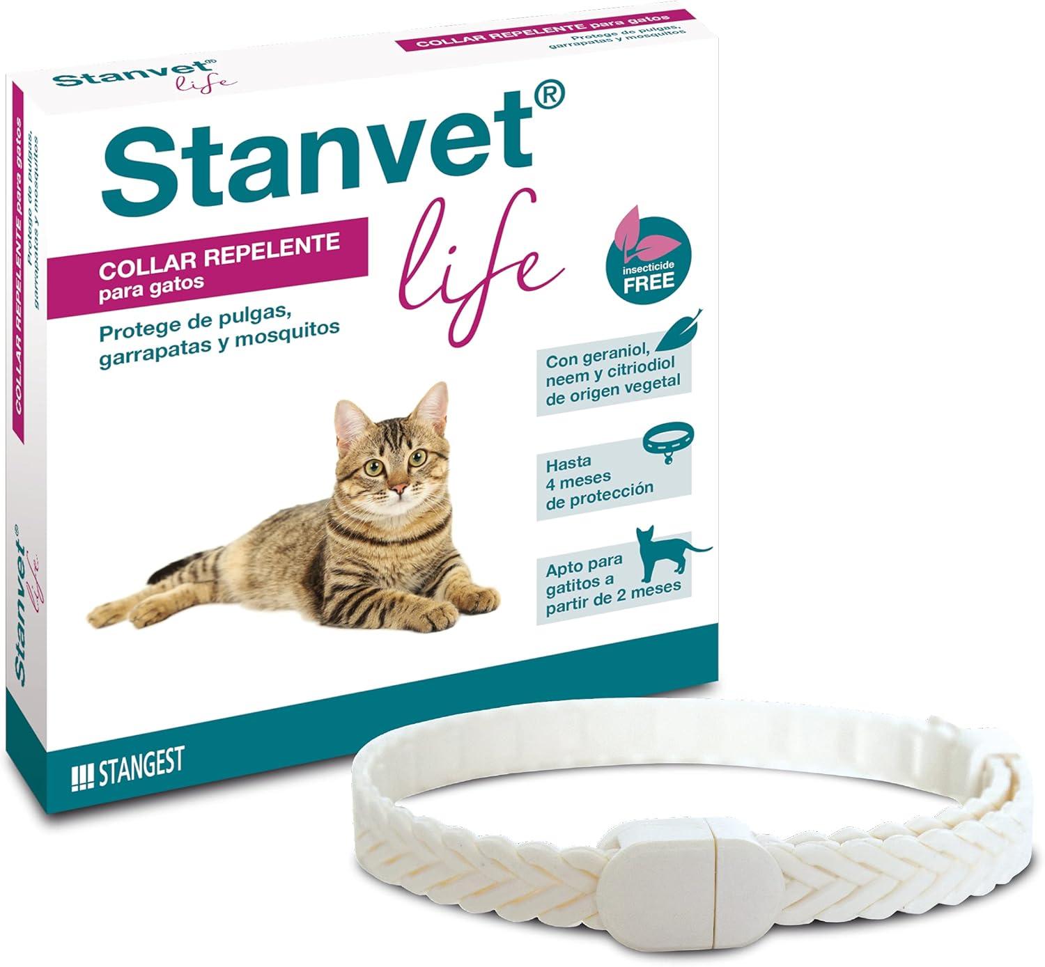 Como en el caso anterior, el collar antiparasitario para gatos Stanvet Life, de Stangest, es un collar natural repelente que contiene aceites esenciales como geraniol, citriodiol, nema y lavanda, sin incluir insecticidas sintéticos, metales pesados ni PVC. También es resistente al agua y ofrece una protección de hasta 4 meses. Puede utilizarse en gatos a partir de los dos meses de edad que pesen más de 500 gramos. Deja un aroma agradable y es seguro y práctico, ya que incorpora una hebilla de seguridad regulable que permite ajustar el collar fácilmente.
