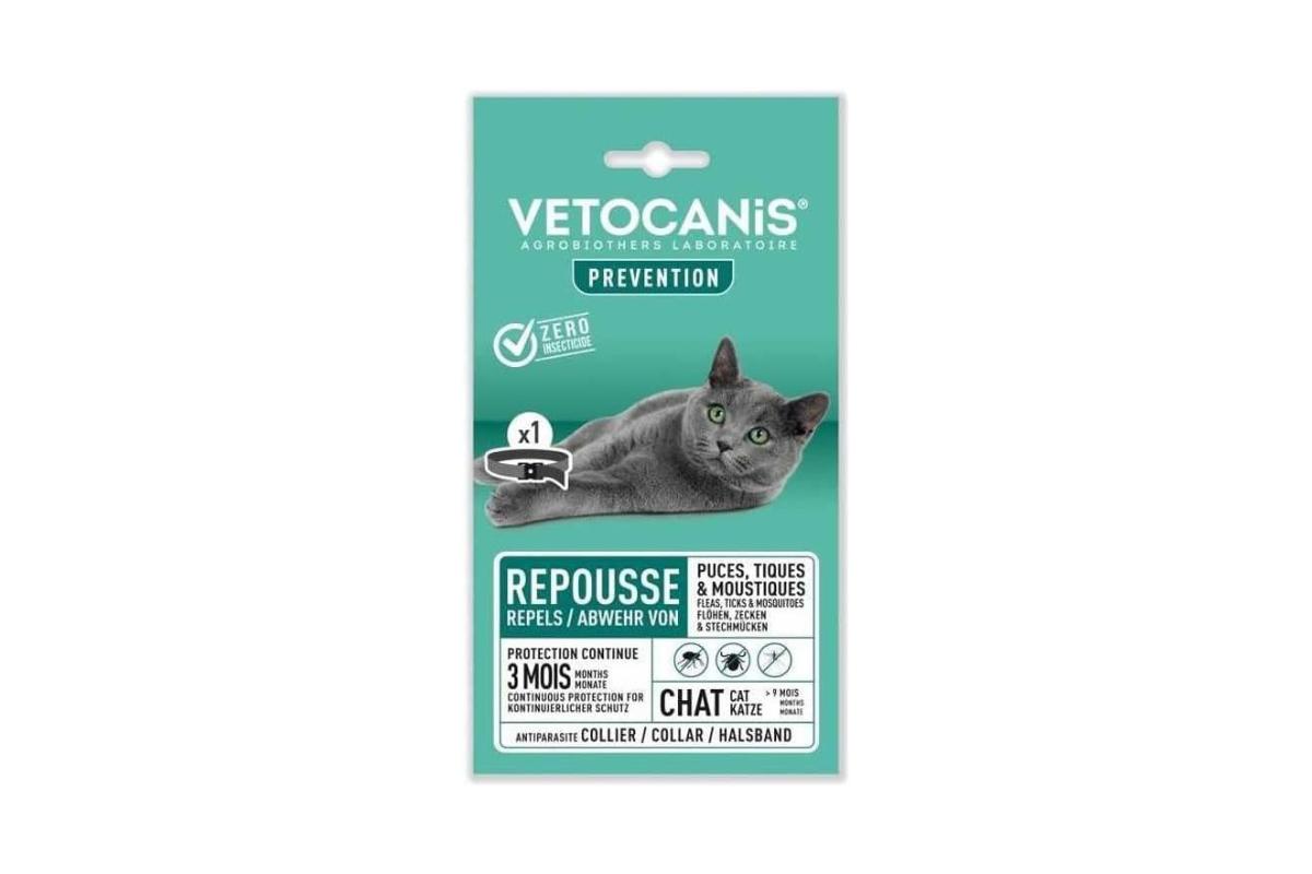 El collar Vetocanis para gatos contiene extractos de lavandín y margosa, los cuales poseen propiedades repelentes contra garrapatas, pulgas y mosquitos durante un periodo de 3 meses. Es un collar de 35 cm que permite un ajuste adecuado mediante su recorte, y puede utilizarse en gatos a partir de los 9 meses de edad. Además, incorpora un sistema antiestrangulamiento mediante un clip de liberación rápida en caso de que el gato se atasque en algún lugar.