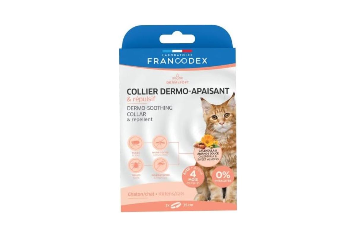 Otro collar antipulgas para gatos de tipo natural que podemos encontrar en el mercado es el collar antiparasitario Francodex. Este collar contiene extractos naturales de geraniol, lavandín y margosa, con propiedades repelentes frente a los parásitos externos que pueden afectar a los gatos durante un periodo de hasta 4 meses, incluidos los mosquitos flebótomos que transmiten la leishmaniosis.