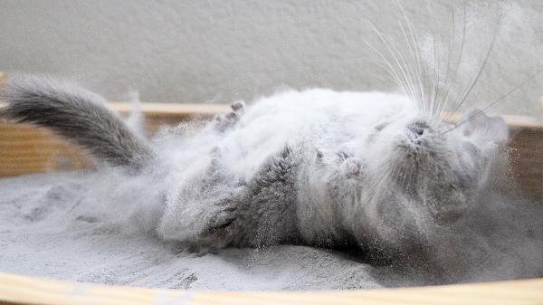 Es por esta razón que las chinchillas realizan baños de arena para lavarse a fondo. Por lo tanto, es imprescindible que tu mascota tenga acceso a un recipiente amplio con arena específica para chinchillas (no sirve cualquier tipo de arena), y verás cómo ella disfrutará revolcándose en la arena.