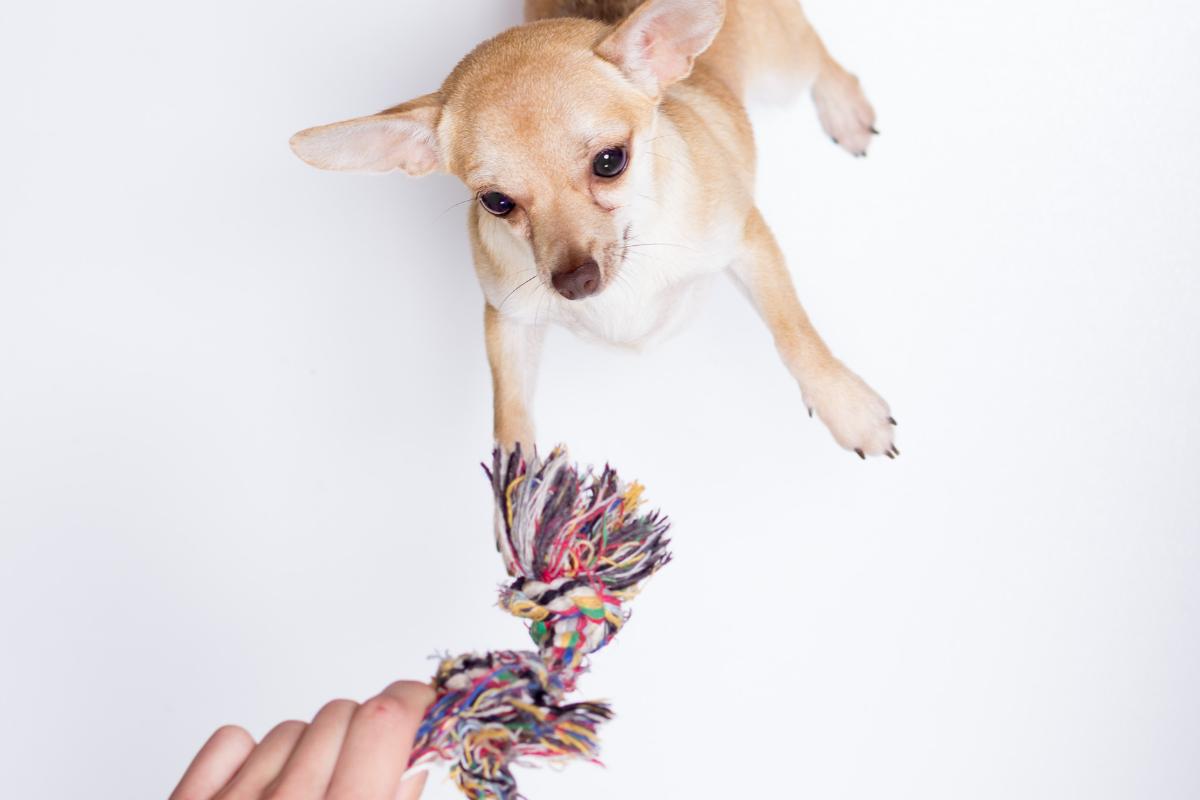 Puedes utilizar las cuerdas trenzadas y juguetes similares para jugar al tira y afloja con tu chihuahua, un juego que les encanta, pero ¡ojo! debes tener en cuenta que tu perro tiene poca fuerza comparada con la tuya o con la de los demás miembros de la familia (incluido los niños), por lo que todos debéis jugar con delicadeza y dejando que, de vez en cuando, sea el perro quien "gane", es decir, quien consiga hacerse con el juguete.
