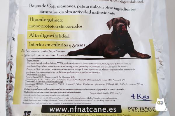 En el caso de la empresa de Palencia NFNatcane, la consideramos entre los mejores piensos hipoalergénicos para perros por la calidad que ofrece, basada en el uso de ingredientes aptos para el consumo humano. Su producto se elabora con carne de buey deshidratada e hidrolizada y no contiene cereales. Sí incluye patatas, manzanas, aceite de salmón o bayas de Goji. Sirve para perros adultos de cualquier tamaño. Además es un pienso bajo en grasas, con lo que es adecuado para perros que necesitan controlar su ingesta calórica o realizan muy poca actividad física.