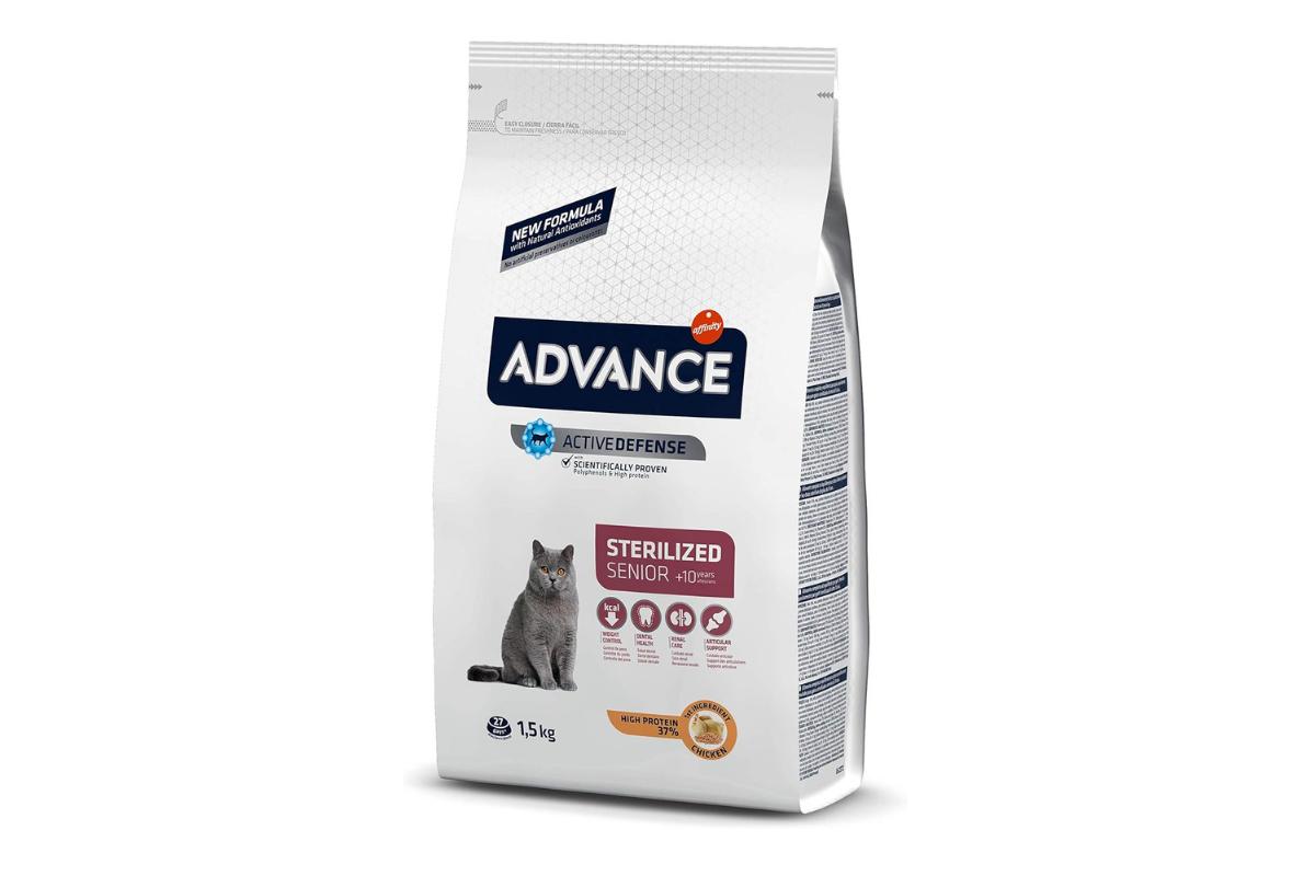 Advance Sterilized Senior +10 años con pollo es un pienso para gatos senior de más de 10 años esterilizados y de calidad por contener un 37% de proteínas, siendo su primer ingrediente un 20% de pollo. Seguido cuenta con otros componentes como son el maíz, la harina de gluten de maíz, la proteína deshidratada de aves de corral, cebada conteniendo un 8%, la grasa animal, el trigo, gluten de trigo, proteínas deshidratadas de cerdo, proteínas de animales hidrolizadas, proteínas de salmón deshidratadas, la fibra vegetal, huevo deshidratado, aceite de pescado, levadura, inulina, cloruro de potasio, proteínas plasmáticas, la sal, glucosamina, sulfato de condroitina y polifenoles naturales.
