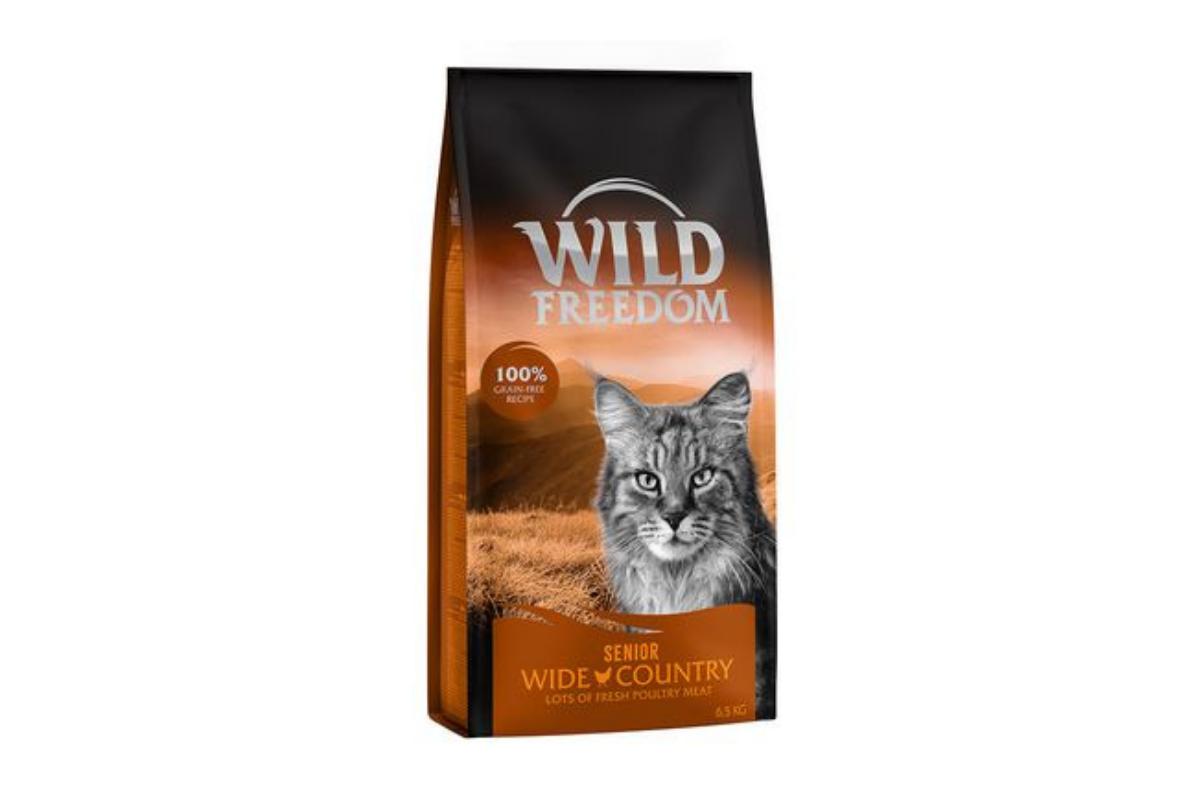 Un alimento para gatos mayores, cuya composición está diseñada específicamente teniendo en cuenta los hábitos alimenticios de los gatos como felinos que son, es el pienso Wild Freedom Senior Wide Country con ave. Se trata de un alimento cuyo componente principal es carne fresca de ave, un 40%, lo que junto con otras proteínas hace que tenga un total de un 70%. Como el anterior, este pienso carece de cereales, conteniendo patata como fuente de carbohidratos que le otorga fibra dietética y oligoelementos.