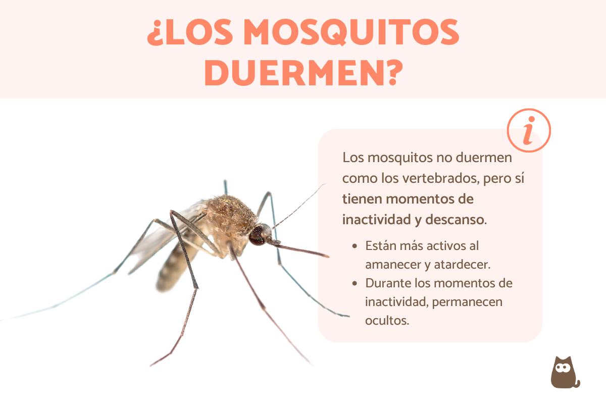 Los mosquitos, al igual que otros insectos, no duermen de la misma manera que los mamíferos. No tienen párpados ni cierran los ojos para dormir. En lugar de eso, los mosquitos tienen períodos de inactividad en los que disminuyen su actividad y pueden descansar. Algunos estudios han descubierto que, si bien no adoptan posturas similares a otros animales, pueden plegar sus patas traseras durante el descanso.