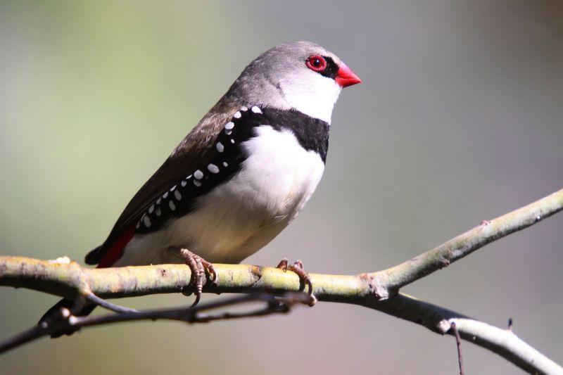 El diamante moteado también proviene de Australia. Este ejemplar mide unos 12 centímetros y a diferencia de los anteriores cuesta trabajo distinguir a los machos de las hembras. Aunque nos podemos guiar por el color del pico (más oscuro en el caso de los machos) la verdadera forma de identificar el sexo es a través del canto, únicamente utilizado por los machos.