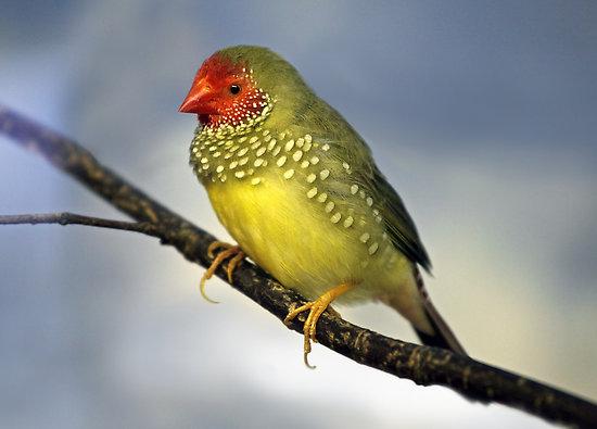 Miden 12 centímetros aproximadamente y suelen ser grises o amarillos con un llamativo color rojo en el pico que se extiende a toda la cara en el caso de los machos (aunque a veces la cara también es de color amarillo vibrante). Al llegar a la etapa adulta les aparecen unos puntos blancos en el plumaje.