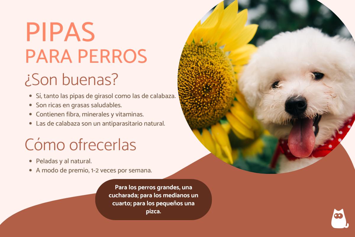 Las pipas deben darse peladas. Los perros pueden comer pipas con cáscara, pero no es lo más recomendable. No las van a digerir y pueden provocarles algún problema. Podemos añadirlas espolvoreándolas sobre la comida u ofrecerlas directamente en la mano, pero hay que saber que los perros van a aprovechar sus nutrientes mejor si las trituramos.
